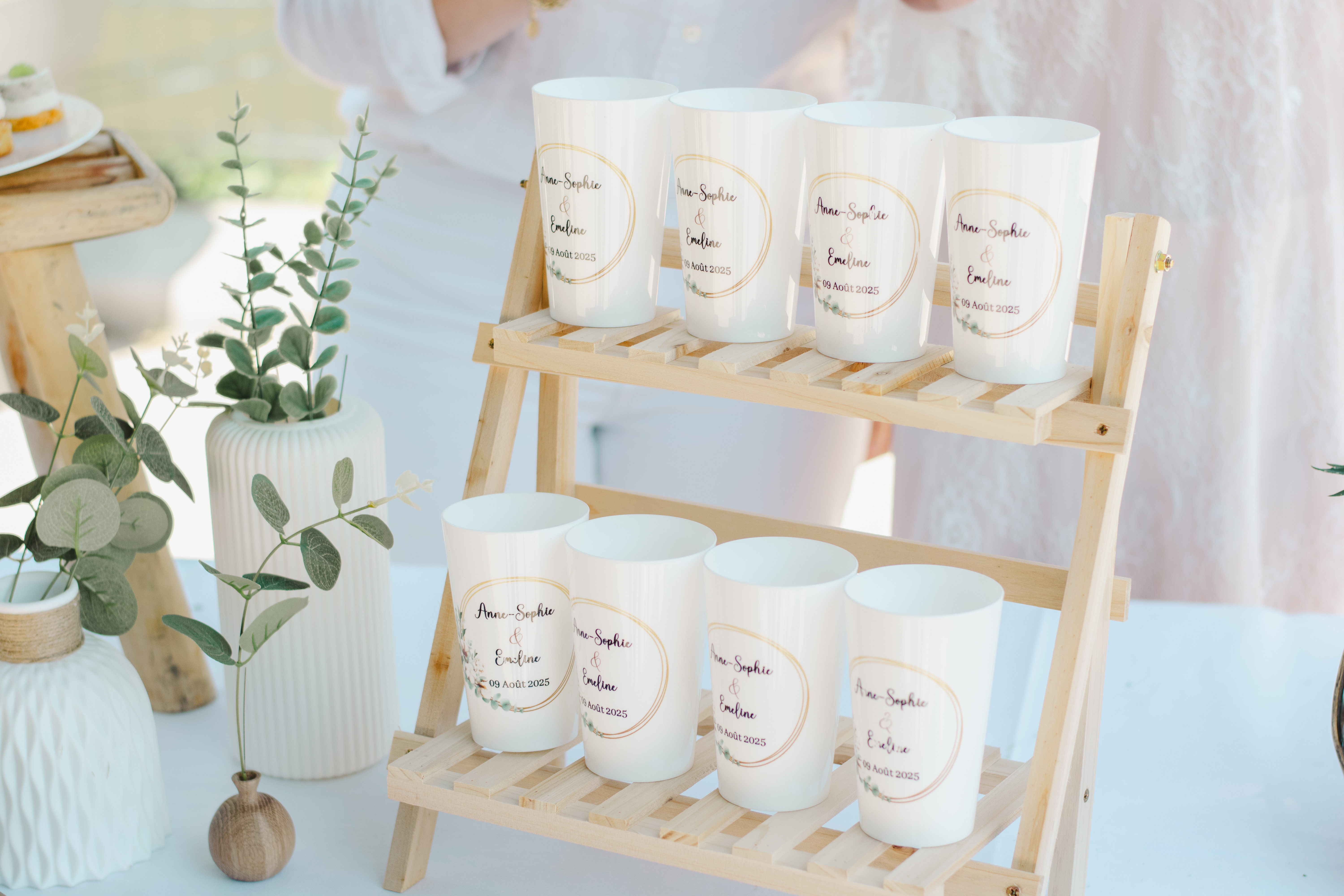 Personnalisez vos gobelets de mariage, avec vos prénoms, la date de votre mariage ou un design unique qui rappelle la décoration de votre mariage